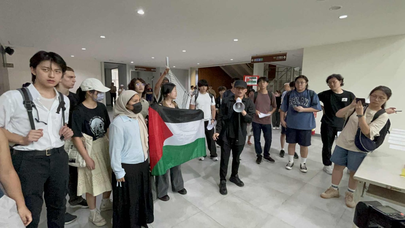 STUDENTS RALLIED MONDAY at National Taiwan University to denounce a talk by U.S. defense-technology entrepreneur Palmer Luckey, accusing him of being a “radical Zionist” whose company profits from alleged Israeli war crimes.