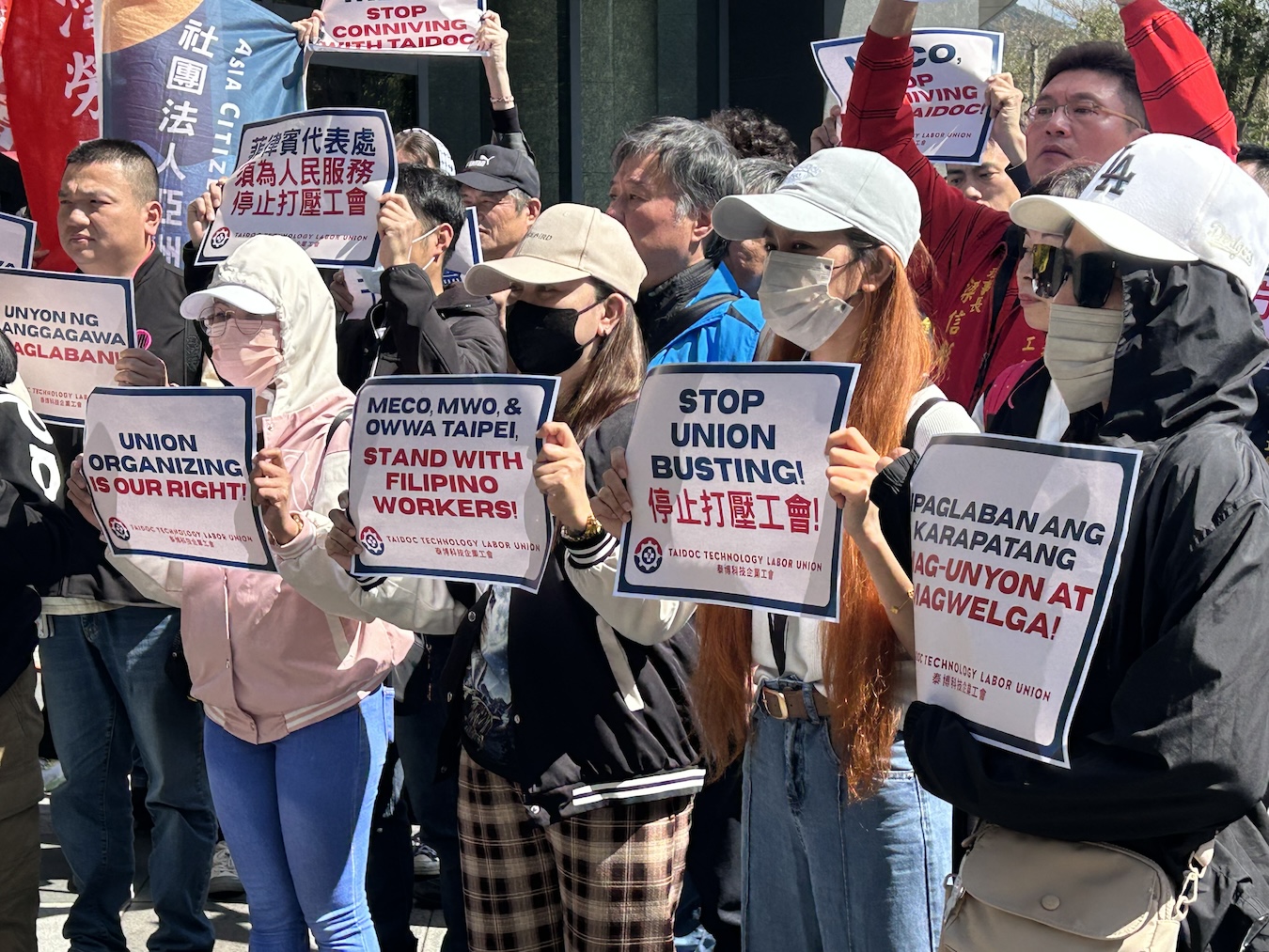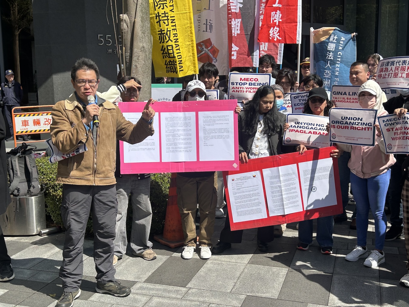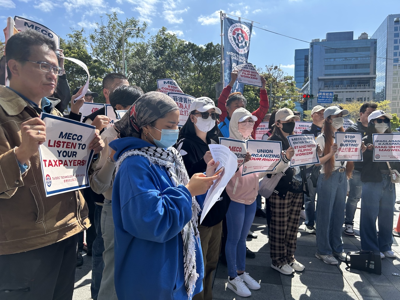 MIGRANT WORKERS and labor advocates protested Sunday outside the Manila Economic and Cultural Office (MECO) in Taipei, accusing the Philippine government’s representatives of siding with management in an ongoing labor dispute at Taiwanese medical device manufacturer Taidoc Technology Corporation.
